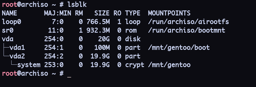 mount /dev/mapper/system /mnt/gentoo