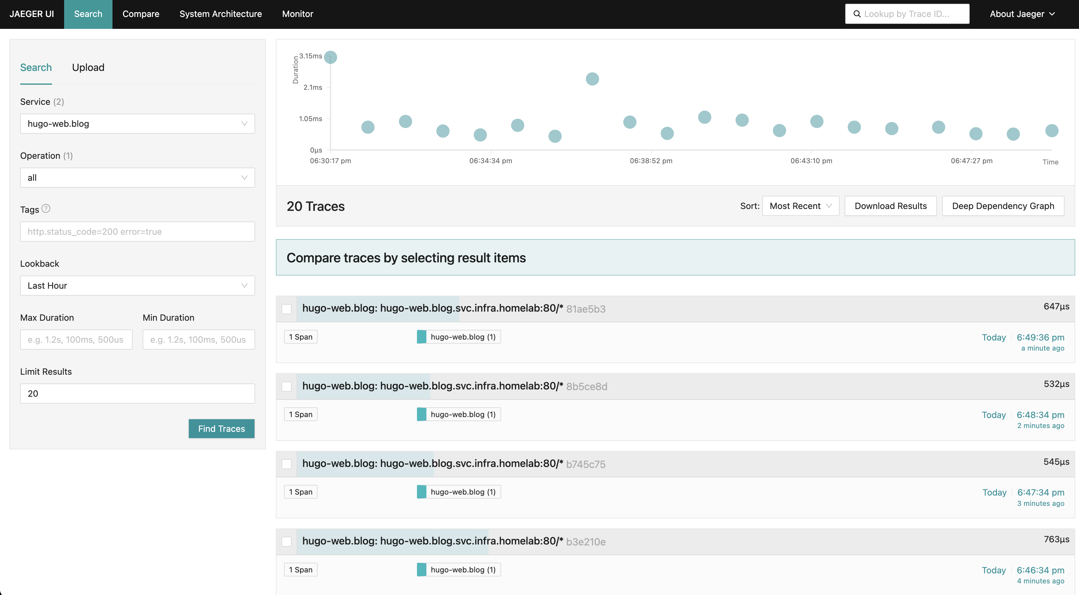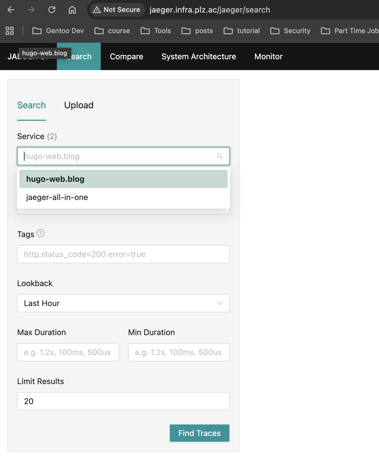 在重启完成之后打开 http://jaeger.infra.plz.ac 查看对应的服务是否可以看到hugo的服务: