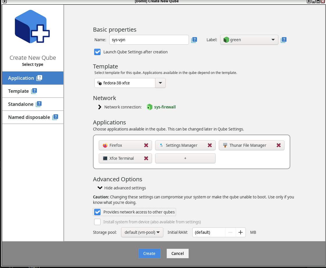 创建的时候需要注意如下图所示中要将Proviers network access to other qubes选择上不然是没办法给到其他的qube使用的。