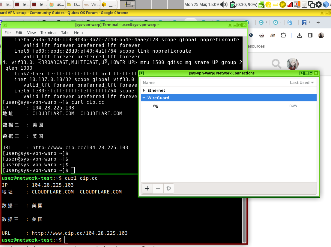这里使用的是Qubes OS 4.2 VPN使用的是Wireguard VPN VPN AppVM的模板是fedora 38 测试的AppVM模板是debian 12